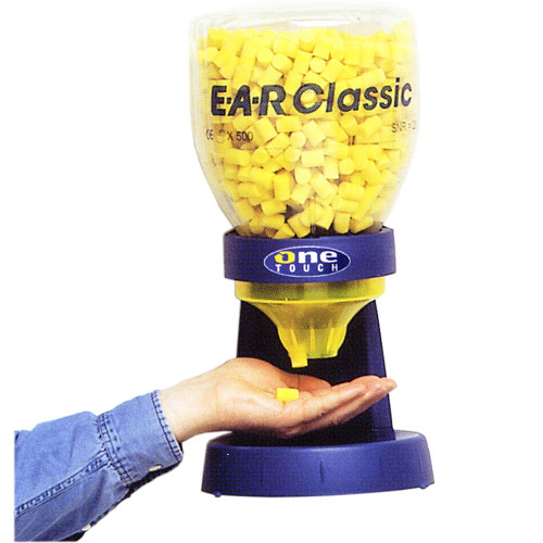 Distributeur pour cartouches de rechange facilement interchangeables, (boites de 500 unités). Utilisation très simple puisqu’il suffi t d’actionner rotativement l’entonnoir du distributeur pour qu’une paire de bouchon tombe directement dans la main.